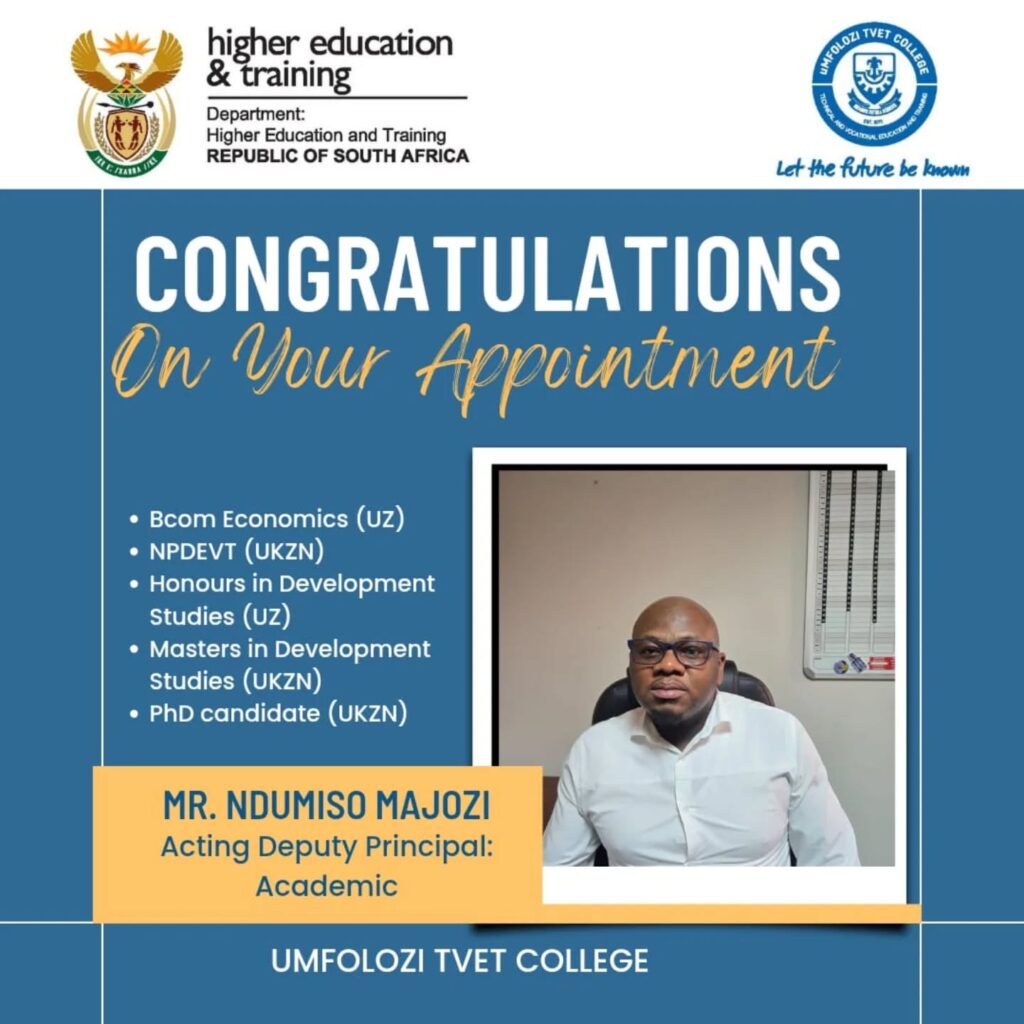 Let the future be known! Category: NEWSBy adminSeptember 10, 2025Post navigationPreviousPrevious post:Asande Mchunu is tackling period poverty through her non-profit organization, The Comfort Circle.NextNext post:ESHOWE CAMPUS CLOSED OFF WOMEN’S MONTH WITH A BANGRelated PostsElections Management Plan 2026February 26, 2026NEDBANK OPPORTUNITY ADVERTISEMENTFebruary 25, 2026SRC Candidates NominationsFebruary 19, 2026Phasing out of NatedOctober 9, 2025Study at uMfolozi College in 2026September 12, 2025Graduation Ceremony 2025September 12, 2025